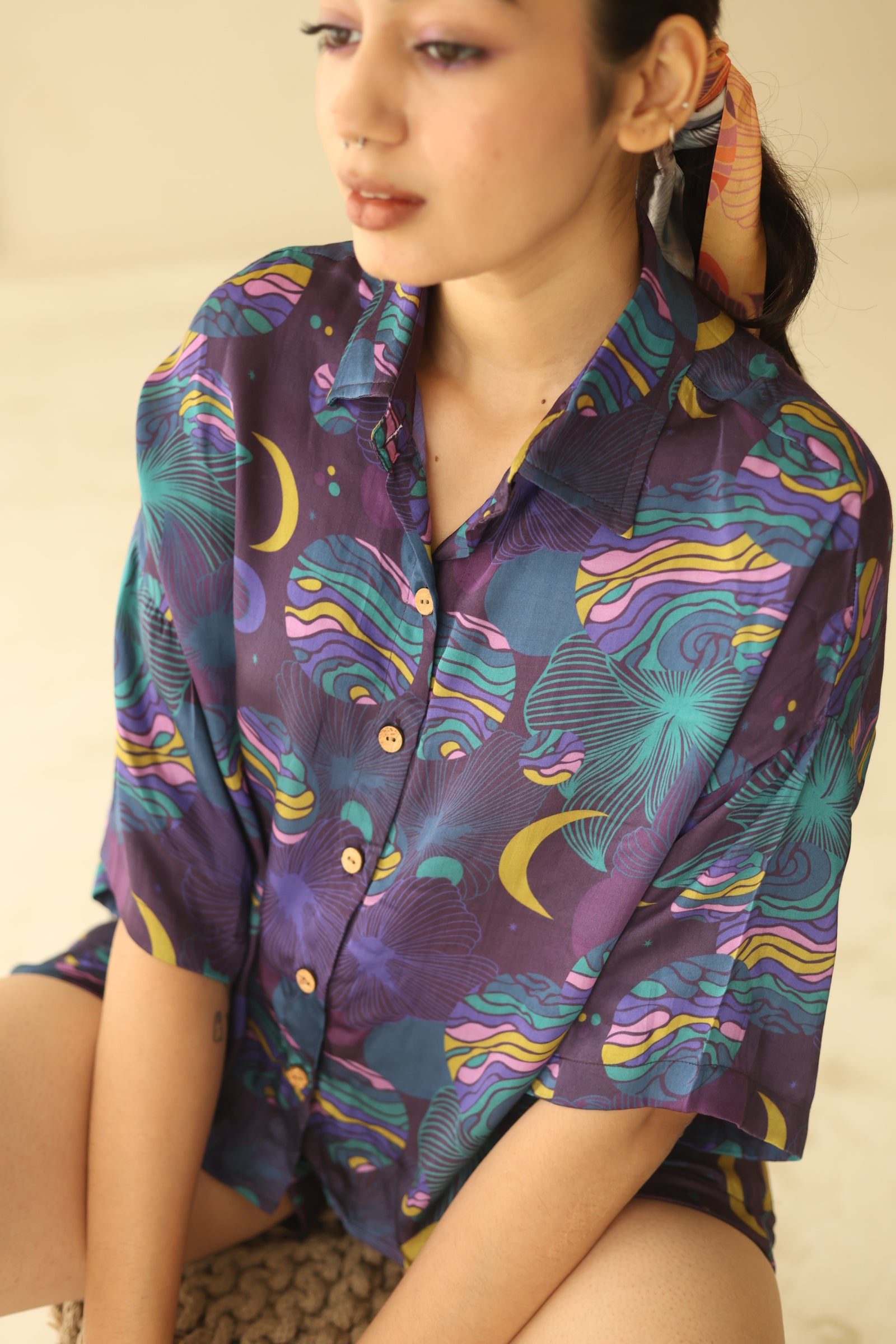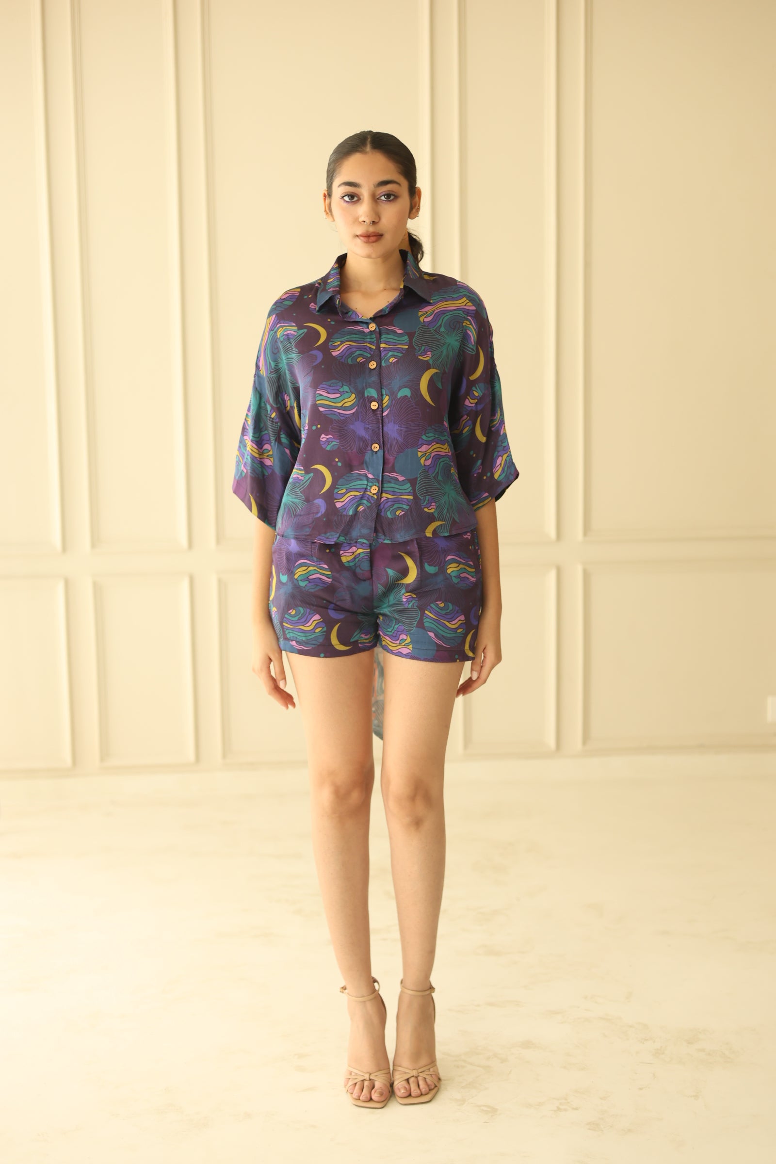 An oversized crop shirt, paired with a fitted pair of high-waisted shorts, this printed set is a summer breeze come alive.