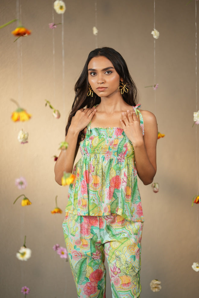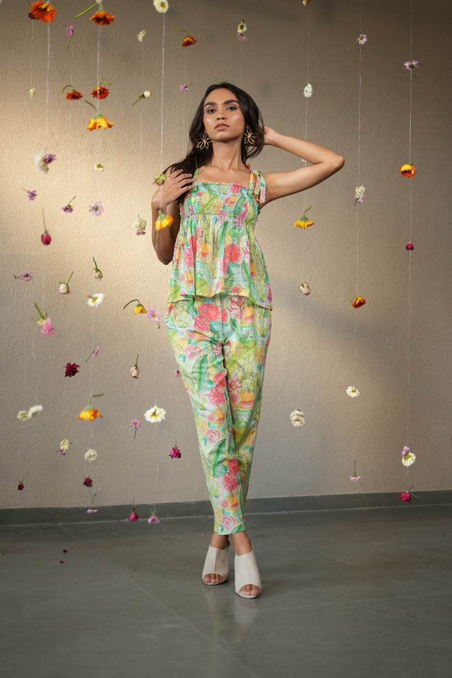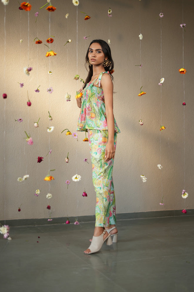 This set includes an elasticated self-tie top with straight pants. A co-ord of your dreams, this set brings the one & done quality to your wardrobe, and you can wear it almost anywhere.