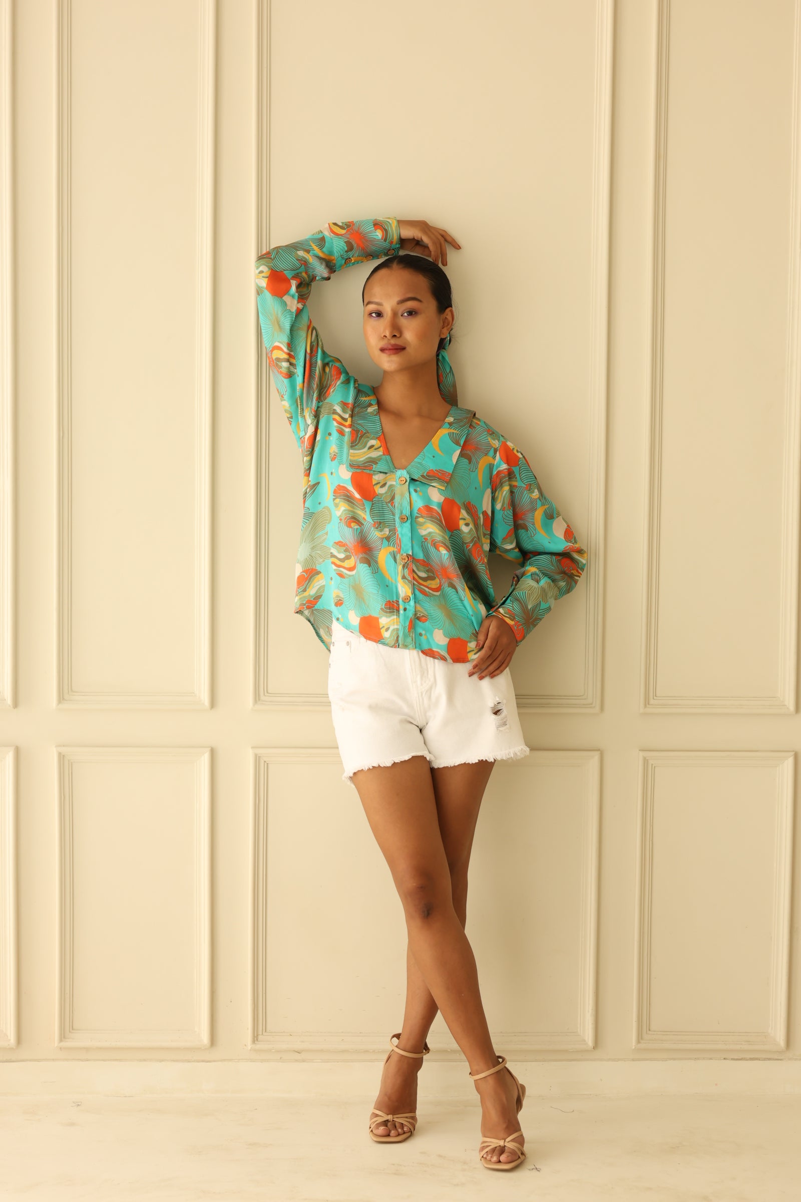 This casual shirt comes with a stylised collar, and a flowy fabric. This season-less shirt checks all the boxes for a wardrobe essential!